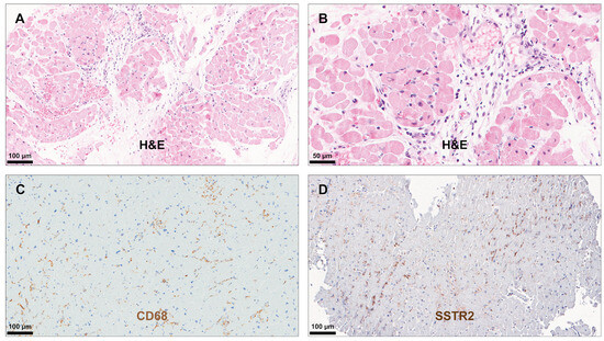 Immunohistochemical analysis in controls. H&E staining revealed a myocardium without signs of inflammatory cell infiltration and/or scars (A,B). Immunohistochemical staining for CD68 confirmed the presence of a few scattered macrophages in the myocardium (C) and for SSTR2 the presence of a weak, unspecific background staining (D). Abbreviations as in Figure 1, Figure 2, Figure 3 and Figure 4.