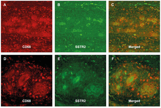 Immunofluorescence analysis in giant-cell myocarditis (A–C) and cardiac sarcoidosis (D–F). Immunofluorescence microscopy of the same section with staining for CD68 (A,D) and SSTR2 (B,E) confirmed in the merged image, (C,F) the expression of SSTR2 on CD68-positive macrophages including multinucleated giant cells (colocalization). Abbreviations as in Figure 1, Figure 2 and Figure 3.
