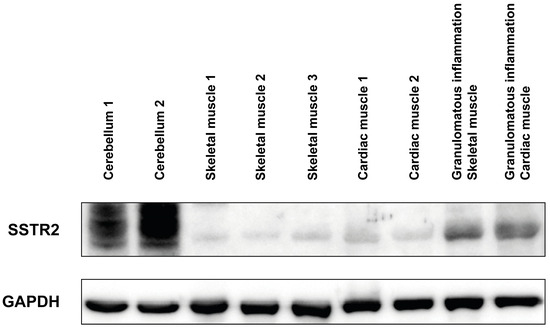 Western blot analysis. The expression of SSTR2 was upregulated in cases of granulomatous inflammation (sarcoidosis) of the skeletal and heart muscle, in contrast to the healthy skeletal and cardiac muscle. Cerebellar tissue was used as positive control. GAPDH, Glyceraldehyde-3-phosphate dehydrogenase (loading control); otherwise, abbreviations as in Figure 1, Figure 2, Figure 3, Figure 4 and Figure 5.