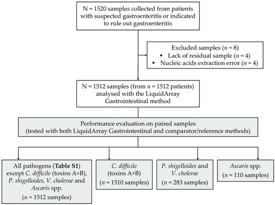 Study flow diagram. Out of the 25 tested pathogens (Table S1), 20 were evaluated by both LiquidArray Gastrointestinal and comparator/reference methods for all analysed samples (n = 1512). For C. difficile toxins A and B testing, 2 out of 1512 comparator data were missing (n = 1510 analysed paired samples). For the rare pathogens P. shigelloides, V. cholerae and Ascaris spp., only subsets of samples were tested with comparator methods, as described in the Materials and Methods section (n = 283 for P. shigelloides and V. cholerae, n = 110 for Ascaris spp.).