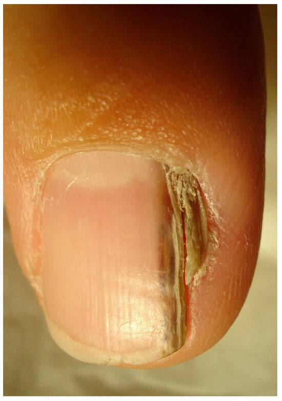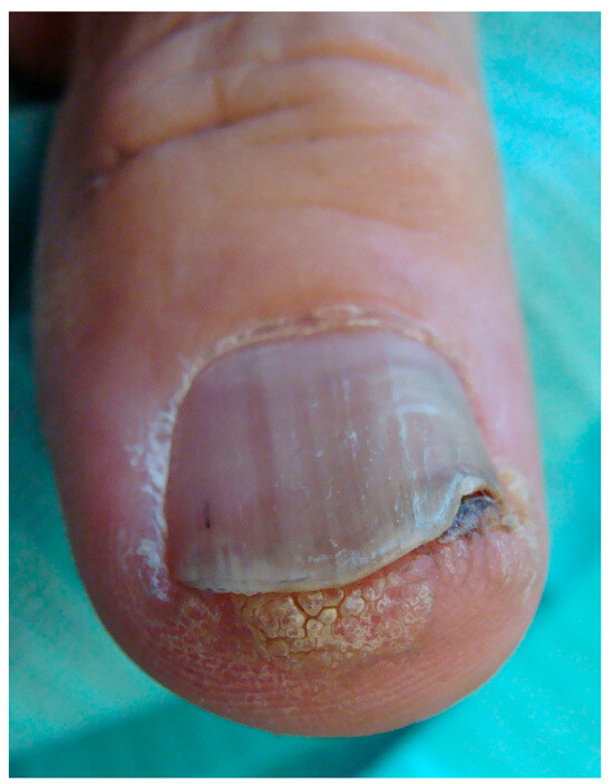 - Fölster-Holst, R.; Rahmatpour Rokni, G.; Bagot, M.; Lallas, A.; Szepietowski, J.; Lotti, T.; Goldust, M. Uncommon presentation of pigmented paraungual basal cell carcinoma on the first toe treated with total excision. Dermatol. Ther. 2020, 33, e13289. [Google Scholar] [CrossRef] [PubMed]