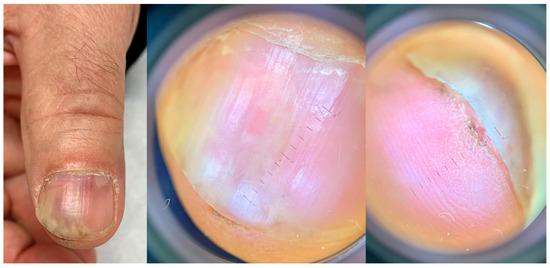 - Sławińska, M.; Żółkiewicz, J.; Ribereau-Gayon, E.; Maińska, U.; Sobjanek, M.; Thomas, L. Intra-operative dermoscopy (onychoscopy) of the nail unit-A systematic review. J. Eur. Acad. Dermatol. Venereol. 2024, 38, 1988–1996. [Google Scholar] [CrossRef]