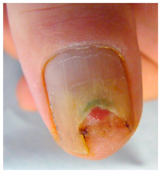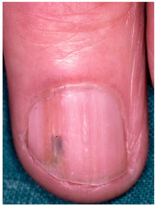 - Perrin, C. Tumors of the nail unit. A review. Part I: Acquired localized longitudinal melanonychia and erythronychia. Am. J. Dermatopathol. 2013, 35, 621–636. [Google Scholar] [CrossRef] [PubMed]