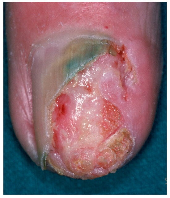 The condition presents as a warty lesion with papillomatous digitations arising from the nail bed (Figure 10), most often involving the thumb, but also sometimes the great toenail and the fifth toenail in patients in their fifth or sixth decade of life [69,70,71]. The clinical differential diagnosis includes verruca vulgaris, SCC and porocarcinoma due to its warty aspect, but also amelanotic melanoma or a deep fungal or bacterial infection due to its destructive potential towards local tissues. No dermoscopy description of this tumor exists in its nail unit localization.