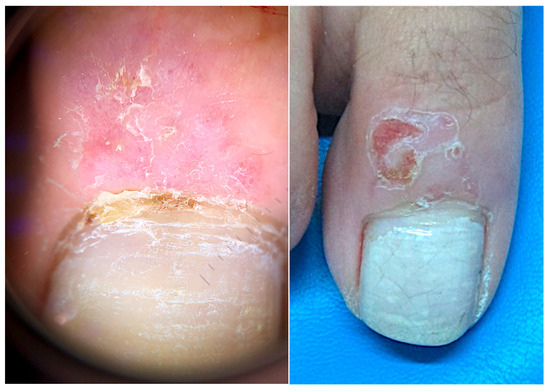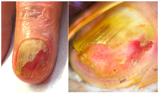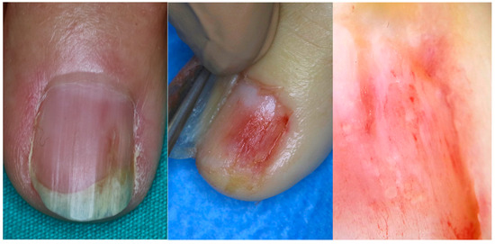 Nail plate removal is, however, not always feasible and dermoscopic examination showing splinter hemorrhages, whitish or yellowish longitudinal lines, distal onycholysis with polycyclic/fuzzy edges and short-segmented longitudinal erythronychia is not helpful for diagnosis because these signs are not specific—they can be present as a result of many other conditions, including inflammatory and traumatic nail disorders. Examination of the free distal margin may instead reveal roughness underneath the nail plate and, above all, oozing [36]—these are suspicious signs that deserve further attention.