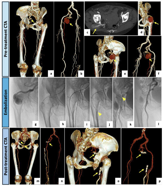 - Rezayat, C.; Sambol, E.; Goldstein, L.; Broderick, S.R.; Karwowski, J.K.; McKinsey, J.F.; Vouyouka, A.G. Ruptured persistent sciatic artery aneurysm managed by endovascular embolization. Ann. Vasc. Surg. 2010, 24, e5–e9. [Google Scholar] [CrossRef]