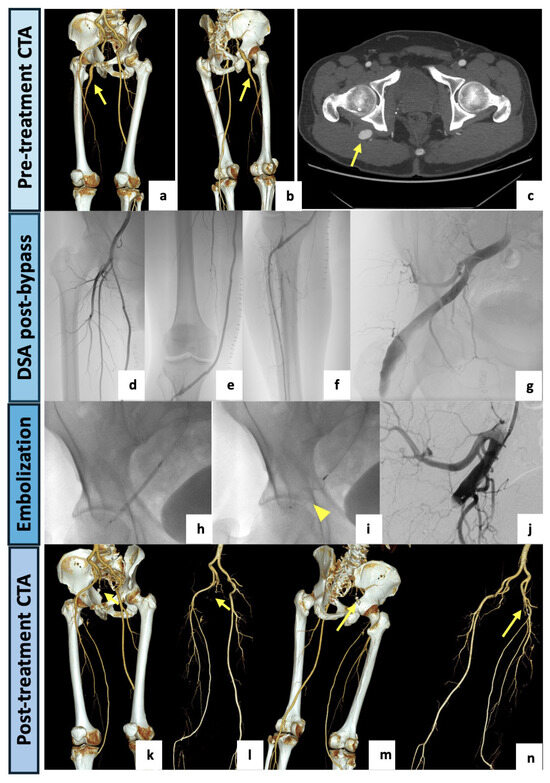 (a,b) VR reconstruction of the preoperative CTA showing a right complete PSA originating from the internal iliac artery (arrow). The right external iliac artery appears hypoplasic and the SFA appears incomplete and diminished in caliber (type 2a). (c) Axial view showing an aneurysmal dilatation (23 mm) of the PSA with luminal thrombus (arrow). A hybrid approach was preferred, with the first step consisting of a left femoro-tibial bypass with the anterior tibial as the target artery. (d–f) Selective angiographic images preliminary to the endovascular step showing a patent femoro-tibial bypass. (g–j) After a contralateral 6F-sheat femoral access, the aneurysmal PSA was selectively catheterized and completely embolized using a 12 mm Amplatzer Vascular Plug II (arrowhead) deployed immediately distally to the internal pudendal artery origin. (k–n) VR reconstructions of the postoperative CTA (3-month) demonstrating the patent femoro-tibial bypass with complete exclusion of the aneurysmal PSA (arrows).