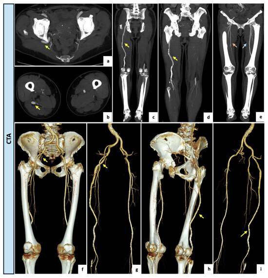 - Mariani, E.; Andreone, A.; Perini, P.; Azzarone, M.; Ucci, A.; Freyrie, A. Endovascular Treatment of Persistent Sciatic Artery Occlusion: Case Report and Literature Review. Ann. Vasc. Surg. 2021, 74, e13–e526. [Google Scholar] [CrossRef]