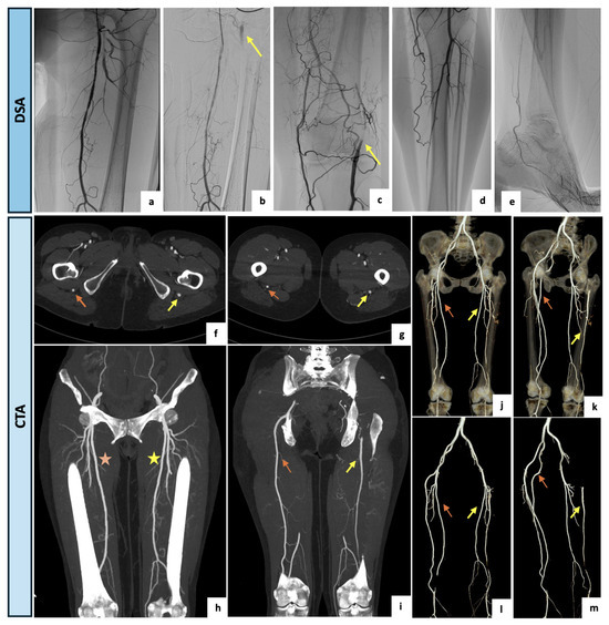 (a–e) Intraprocedural selective angiographic images obtained after a left antegrade common femoral access. (a–e) The angiograms demonstrate a diffusely hypoplasic and interrupted left SFA, lacking the usual continuation, and a popliteal artery supplied by collateral pathways originating from the distal small branches of the SFA and the deep femoral axis. (b,c) Surprisingly, an arterial vessel suggestive of incomplete PSA was retrograde perfused via deep femoral collateral pathways and visualized both proximally and distally as brief tracts (yellow arrows). (f–i) Axial and coronal maximal intensity projection views of the CTA confirming a bilateral PSA. On the left side, a type 2A PSA (yellow arrows) and a distal significant stenosis of the SFA (yellow asterisk) were detected. The right lower limb presented a type 1 complete PSA (orange arrow) along with a regular SFA (orange asterisk). (j–m) Three-dimensional reconstructions with and without bone structures. On the left side, a type 2a PSA with a proximal focal occlusion and re-habitation via gluteal collateral pathways, and a distal femoral significant stenosis was detected (yellow arrows). The right lower limb presented a type 1 complete PSA (orange arrows).