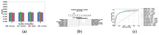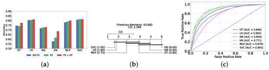Figure 4a provides a summary of this stage, illustrating the performance of classical ML models with and without the application of feature selection and hyperparameter optimization steps. As observed, the performance of all models, except for DT, improves after feature selection and further increases following hyperparameter optimization (including DT). This demonstrates the significance of these steps in optimizing model performance. Figure 4b shows the Friedman–Nemenyi test, revealing that SVC, LR, and MLP are statistically similar in performance, while these models are distinct from KNN, NB, and DT. Lastly, Figure 4c depicts the Receiver Operating Characteristic (ROC) curves along with their respective AUC scores, further evidencing the classifiers’ effectiveness in differentiating classes.