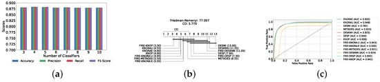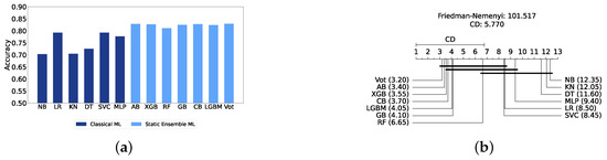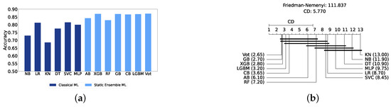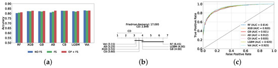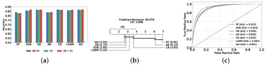The most effective static ensemble model identified was the Vot classifier, which achieved an accuracy and F1-score of 87.08% ± 1.06% and 87.08% ± 1.06%, respectively. The Vot classifier excels because it leverages the strengths of multiple base models, combining their predictions to produce a more robust and accurate final decision. Moreover, this represents a significant improvement over the SVC model. Figure 5a provides a comparative analysis of model performance with and without the application of feature selection and hyperparameter optimization. It should be noted that some models experienced a decrease in accuracy following feature selection (without hyperparameter optimization), suggesting that a larger feature set may sometimes be beneficial. However, after optimizing hyperparameters, all models showed an increase in accuracy, indicating that optimizing hyperparameters for the new feature set is crucial for improving performance. Furthermore, all static ensemble models outperformed all classical ML models, highlighting the superiority of static ensemble methods over classical approaches. Figure 5b shows that Vot, GB, XGB, LGBM, and CB exhibit similar statistical performance, distinct from AB and RF, with RF being the lowest-ranked model. Finally, Figure 5c depicts the ROC curves alongside their corresponding AUC scores.