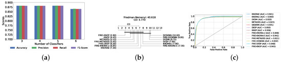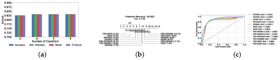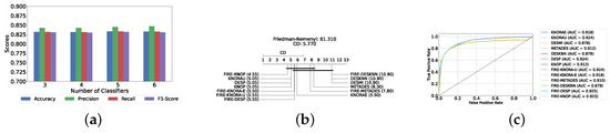Performance comparison of different classical classifiers at the detection layer. Abbreviations: feature selection (fs); hyperparameter optimization (op); critical difference (cd); area under curve (auc). (a) Performance of classical classifiers with and without feature selection and optimization (detection layer). (b) Comparison of classical classifiers based on the Friedman test (detection layer). (c) AUC scores for classical classifiers with feature selection and hyperparameter optimization (detection layer).