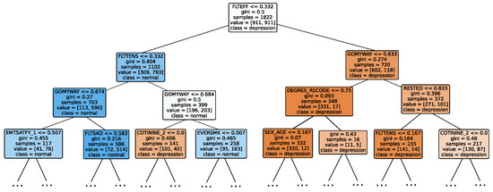 Model explainability is conducted separately for all three layers. For the two primary layers—detection and severity prediction—both global explainability and local-instance explainability methods are employed. In the case of global explainability, the best-performing model from either the classical or static ensemble models is selected to generate SHAP summary plots and SHAP beeswarm plots. These visualizations provide insights into feature importance, illustrating how individual features contribute to the presence of depression in the detection layer or to the severity of depression in the severity prediction layer. Additionally, a DT visualization is created to demonstrate the decision-making process of the DT model. For local-instance explainability, waterfall plots are utilized to illustrate the model’s decision-making process for individual cases. In the detection layer, waterfall plots are generated to compare normal versus depressed individuals, while in the severity prediction layer, they compare mild versus moderate–severe depression cases. Furthermore, several sequential decision-making paths from a DT will be shown for both layers to see how a DT makes its decision when predicting the presence of depression or the severity of depression in an individual. In the confirmation layer (regression), only local-instance explainability is applied, specifically through the use of waterfall plots. These plots are generated for two extreme cases: a PHQ-9 score of 0 (indicating no depression) and a PHQ-9 score of 27 (indicating severe depression), providing detailed insights into the factors influencing the lowest and highest possible depression scores.