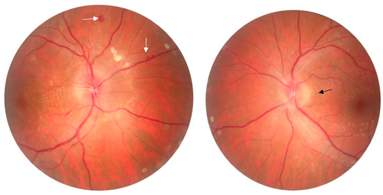 Retinophotography of both eyes (OU) in a 33-year-old Caucasian man with no significant medical history presenting to our service with decreased visual acuity for about a week. There were no other constitutional symptoms, history of tuberculosis or contact with dogs, cats or other pets. The ophthalmological examination revealed best-corrected visual acuity (BCVA) in the right eye (RE) of 0.8 and 0.9 for the left eye (LE). Intraocular pressure (IOP) was 20 mmHg in RE and 18 mmHg in LE. Slit-lamp examination (OU) showed no evidence of intraocular inflammation in the anterior chamber or vitreous cavity. Color vision was impaired in the right eye more than that in the left eye. There was no pain on ocular movement. Examination of the posterior pole (RE) shows an elevated optic nerve papilla with blurred contour, a few peripapillary microhemorrhages (white arrow) and a cotton wool spot, as well as hard exudates, characteristically arranged in the pattern of an incomplete macular fan. In the LE we noticed a slightly elevated optic nerve papilla with blurred contour, a few exudates in the peripapillary region (black arrow) and some perivascular microhemorrhages in the infero-temporal sector.
