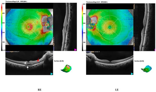 Optical coherence tomography (OCT) of the OU at first presentation showed bilateral papilledema with peripapillary subretinal fluid presence. In the RE, we noticed the presence of intraretinal and subretinal fluid (white arrow) extending from the optic disc along with neurosensory macular detachment and hard exudates in the inner layers of the retina (red arrow). Central macular thickness was 429 μm in the right eye and 317 μm in the left eye.