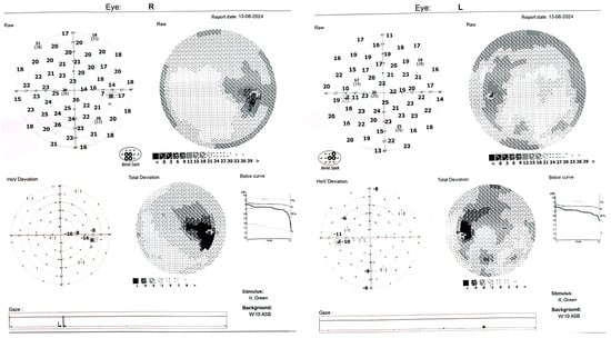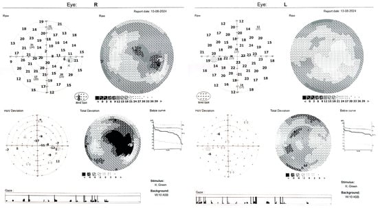 One month later, BCVA was 0.9 in the right eye (RE) and 1 in the left eye (LE). A decrease in macular edema (RE) and a slight improvement in visual field (OU) (Figure 4) were noticed. Six weeks after the first presentation, the optic nerve swelling had decreased but exudates persisted in the peripapillary region (Figure 5). Treatment options of neuroretinitis include combination therapy, steroids and antibiotics, depending on the underlying cause. It is usually a self-limiting disease. With or without treatment, most patients have an excellent recovery of vision [32]. Normally, the optic nerve will heal in 6–8 weeks, with manifestation of a normal or slightly pale optic disk. Meanwhile the macula exudates will resolve more slowly, starting several to 6–12 weeks [33,34,35]. However, some cases have been reported in the literature without visual improvement due to optic disk atrophy [36]. Low visual acuity has a crucial impact on quality of life, especially in young patients [37]. Steroid pulse therapy was used in this case as the first line of treatment when infectious reasons were ruled out. An important aspect to highlight is the asymmetry of the disease in the left eye. A plausible explanation could be the start of corticosteroid treatment, although there is some evidence that corticosteroids are more effective when used in combination with specific antibiotics [32].