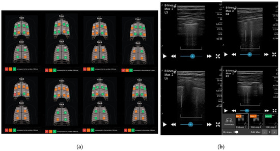 LUS imaging: scanned regions with color code assessment (a) and B-lines within lung sliding (b).
