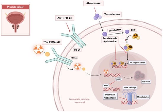 Main mechanisms of therapeutic agents for prostate cancer. Image created with https://www.biorender.com (accessed on 28 October 2024).