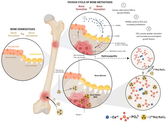 Representation of the vicious cycle of bone metastases and the distribution of radium-223 in the bone ([223Ra] RaCl2’s mechanism of action). Image created with https://www.biorender.com.