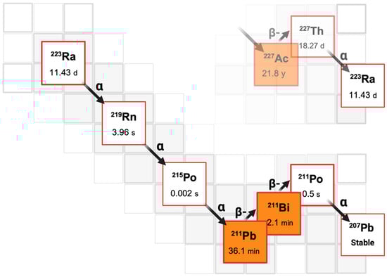 Origin of decay chain-generating radium-223 (223Ra) (t½ = 11.43 days) and its subsequent transformations (four α emissions and two β− emissions) to stable 207Pb. Image created with https://www.biorender.com.