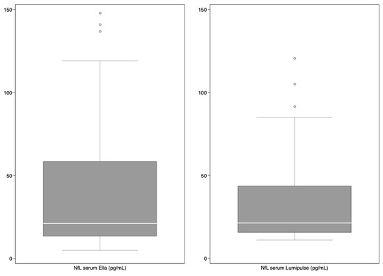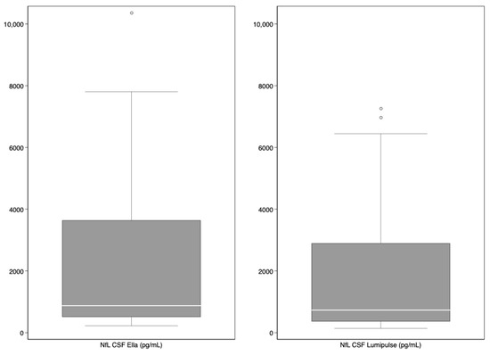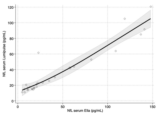 We observed that the CSF concentrations exceeded those in the serum with both the assays, being 42- and 35-fold higher using Lumipulse™ and ELLA™, respectively. This is in line with previous studies, which have consistently shown that serum NfLs are a reliable proxy for CSF NfL concentrations in different neurological diseases, albeit measurable in smaller concentrations [24,39,40,41].
