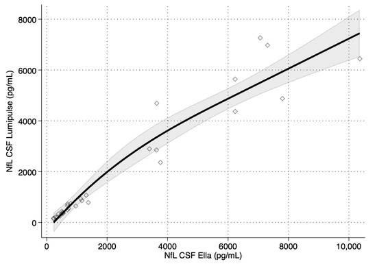 Figure 2. Spline regression analysis of neurofilament light chain (NfL) concentrations using the two assays (Ella™ and Lumipulse™). The solid line represents the regression analysis with upper and lower confidence interval limits (shaded grey area). Diamonds represent individual observations.