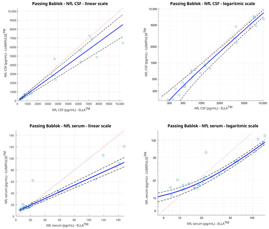 Figure 3. Passing–Bablok regression analysis of neurofilament light chain (NfL) concentration calculated with 30 samples by the Ella™ platform compared to the Lumipulse™ platform. Results are shown both on linear and logarithmic scales. Solid blue line: Passing–Bablok regression line; dashed red line: identity line; dashed grey lines: 95% confidence intervals. These graphics may be interpreted as follows: if the red identity line is outside of the credible intervals of the Passing–Bablok regression line, this indicates a proportional difference between the two assays and thus a need for correction.