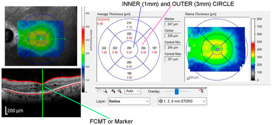 Spectral domain-optical coherence tomography (SD-OCT) of a retinitis pigmentosa (RP) patient affected by cystoid macular edema (CME). In the left panel, the green line indicates the thickness of the central macular fovea (FCMT), or fovea centralis. In the right panel, the central 1 mm circle and the outer 3 mm circle are highlighted, where measurements were taken for the RP and control groups.
