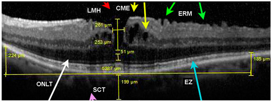 SD-OCT macular scan of a patient with RP, displaying a lamellar macular hole (LMH); (red arrow), cystoid macular edema (CME) with micro- and macro-pseudocysts (yellow arrows); an epiretinal membrane (ERM) (green arrows); outer nuclear layer thickness (ONLT) (white arrow); subfoveal choroid thickness (SCT) (pink arrow) and an ellipsoid zone (EZ) (blue arrow) that ends at the edges of the macular region, characteristic of hereditary retinal dystrophy.