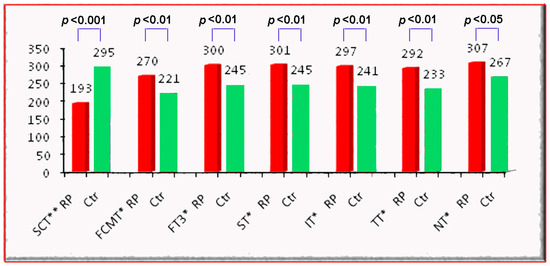 Comparison of thickness measurements between the retinitis pigmentosa (RP) patient group and control group (Ctr). Values are presented as group averages. Measurements include subfoveal choroidal thickness (SCT) within 1.5 mm (in μm); foveal thickness at the central point (FCMT) (μm); foveal thickness in the 3 mm outer circle (FT3) (μm); and superior (ST), inferior (IT), temporal (TT), and nasal thickness (NT) in the 3 mm outer circle (μm). Statistically significant differences are marked by asterisks (*) with p value < 0.05.
