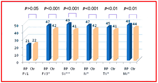 Comparison of the volume measurements between the retinitis pigmentosa (RP) patient group and control group (Ctr). Values are presented as group averages. Measurements include foveal volume in the 1 mm inner circle (FV1) (mm3); foveal volume in the 3 mm outer circle (FV3) (mm3); and superior (SV), inferior (IV), temporal (TV), and nasal volume (NV) in the 3 mm outer circle (mm3). Statistically significant differences are marked by asterisks (*) with p value < 0.05.