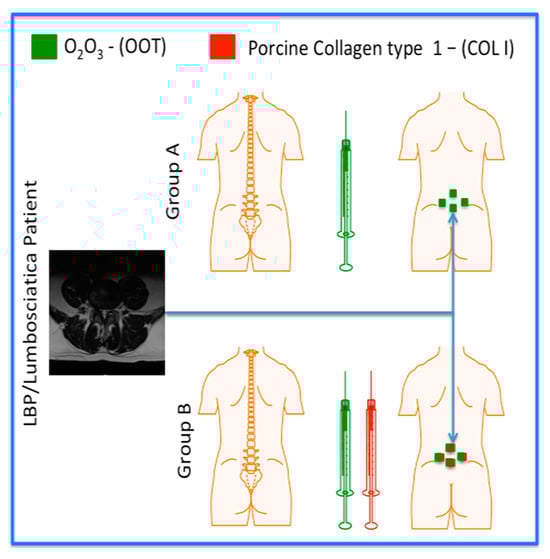 All patients (A and B) had been treated with intramuscular paravertebral injections of O2O3 (concentration equal to 10 μg/mL; OOT treatment). The total volume administered corresponds to 20 mL divided into four injection sites (5 mL per injection site), through the 32 G needle (size: 0.7 mm × 32 mm). All patients underwent treatment twice a week for a total of 8 consecutive infiltrative treatments (one month). Patients included in group B additionally received intramuscular administration of a vial containing 2 mL of porcine collagen type 1 (MD-LUMBAR, Guna, Milan, Italy; COL I) divided into 4 injection sites (0.5 mL per injection site), through a 27 G needle (size: 0.4 × 19 mm).