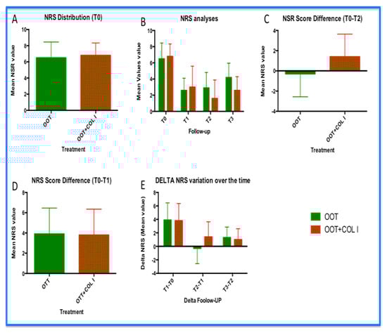 All patients were assessed with the NRS scale at time T0 before starting treatment. The mean pre-treatment NRS score was 6.5 ± 1.95 and 6.8 ± 1.53 for group A and group B, respectively. No statistical differences were observed between the two groups at the beginning of the protocols (Figure 2A). Similarly, the positive reduction in NRS was observed in two groups (Figure 2B,C), where the mean values were 3.9 ± 2.55 and 3.8 ± 2.50 for group A and group B, respectively. At these two checkpoints, we can assume that there were no statistical differences by comparing the two treatments. However, comparing the follow-up breakpoint, we observed statistical differences in terms of the mean value of NRS (Figure 2B, p < 0.001) and their delta change of the cognate NRS over time (Figure 2D; p < 0.001). In particular, after the treatment, we obtained a reduction of 5.2 points in the NRS scale (average value) in the OOT+COL I treatment instead of 3.6 points (NRS scale) in the OOT treatment alone. However, the percentage difference in reduction was 55.385% and 76.471% in group A and B, respectively. A total of 21% was present between the two treatment arms (Figure 2D). As a final concept, we carefully observed the delta NRS difference between the two treatment groups at point T2, where the changes in the NRS value (expressed as the improvement of the delta point per month) are zero in OOT and 1.4 in OOT+COL I. In addition, at the six-month follow-up, the effect of the addition of COL I treatment seems to better preserve the results obtained with OOT alone (Figure 2B,D).