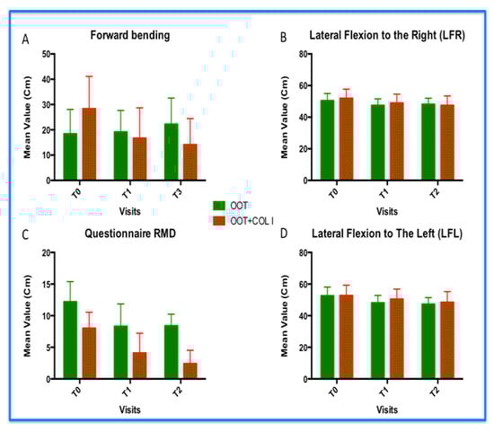 Function improvement analyses show a positive trend in the OOT+COL I treatment compared to those observed in the OOT treatment alone (group B). The difference observed in the forward flexion analyses reveals that the OOT+COL I treatment (group B) had the mean distance values between all three visits. In particular, we observed an antiparallel trend by comparing the two groups. The OOT arm increased its main values during the visit, while the OOT+COL I treatments decreased them (p < 0.0001). The result could indicate that the OOT+COL I treatment seems to be more effective in the short term and in the long term. In fact, the distribution of data could indicate that the OOT+COL I treatment also maintained its effect as a booster and better maintenance, compared to the OOT treatment (Figure 3A). Similarly, the OOT+COL I treatment (group B) clarified a level of superiority over the OOT treatment (Figure 3C) with regard to the disability questionnaire. Thus far, we would like to mention that the decrease in RMD-Q represents a successful treatment. In the red columns, we can see that the level of disability decreases between visits, while the same parameter in the green columns (OOT treatment only) remains stable after the second visit (p < 0.001). In fact, comparing the average value per visit, we observed at least 5.0 points of difference between the average values (Figure 4C). Looking for the lateral, right (Figure 3B), and left (Figure 3D) flexion, no significant differences were obtained from the ANOVA analyses between the OOT and OOT+COL I treatments (p > 0.05). However, the results regarding patients included inside group B (Figure 3B,D) showed better results. Overall, we can assess that no inferiority level of the OOT+COL I treatment could be accepted. Movement analyses in the OOT+COL I groups revealed that the patients’ body trunk appears to be more flexible, particularly when looking for the forward flexion parameter.