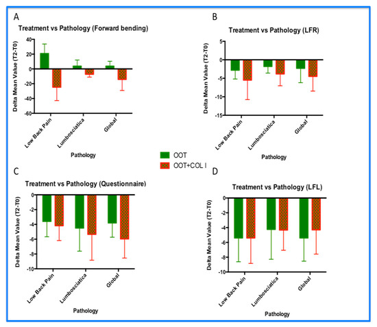 Treatment vs. analysis of pathologies. Results of: (A) forward bending; (B) lateral flexion to the right (LFR); (C) disability questionnaire; and (D) lateral flexion to the left (LFL). The results reported the differences between the mean value obtained at the T0 visit and the T2 visit (T2–T0). Negative values represent the positive effects of treatments. In graphs (A,C), the decrease in their average value is statistically significant (p < 0.001), where the differences between OOT vs. OOT+COL I are reversed as shown in Figure 4A. In addition, graph (A) shows an anti-parallel parameter of the direction of forward bends. Conversely, the values reported in the questionnaire analyses revealed a progressive positive trend for both treatments; however, in the OOT+COL I treatment, the decrease was significantly higher than that observed in the OOT treatment alone, while, within graphs (B,D) (lateral motion), the LFR and LFL analyses did not show significant differences comparing OOT vs. OOT+COL I. However, the positivity trend was observed in both movements, and the result in LFR reached a very close significant value (p = 0.0606). In addition, no inferiority level was observed for OOT+COL I compared to OOT treatments alone, considering all the parameters analyzed.