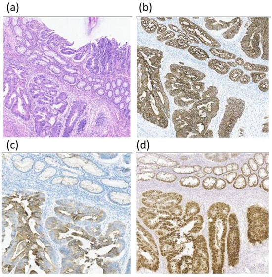 The patient was diagnosed with rectal cancer with liver metastases (T3N0M1a, stage IVa) and underwent 4 cycles of neoadjuvant chemotherapy according to the XELOX scheme (capecitabine and oxaliplatin) with positive dynamics, namely, reduction in liver metastases according to CT scan. In July 2017, right hemihepatectomy, cholecystectomy, and right adrenalectomy were performed. Histological examination of the liver lesions revealed metastases of colon adenocarcinoma, Grade 2 (G2), but there were no tumor elements in the adjacent lymph nodes. After 2.5 months, rectal resection was performed. The morphological pattern was described as adenocarcinoma G2, growing into the myenteron and invading the adjacent fat tissue, with ulceration, and cancer emboli in the vessels were noted (Figure 2a). Immunohistochemistry revealed expression of specific colon cancer markers: CK8/18, CK20, and CDX2 (Figure 2b–d).