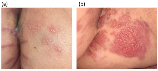 - Torné, J.; Bonaut, B.; Sanz, C.; Martínez, C.; Torrero, M.V.; Miranda-Romero, A. Metástasis cutáneas de adenocarcinoma de recto con distribución herpetiforme [Cutaneous metastases of rectal adenocarcinoma in a herpetiform distribution]. Actas Dermosifiliogr. 2006, 97, 206–207. [Google Scholar] [CrossRef]