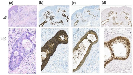 Histological (a) and IHC (b–d) assays of cutaneous metastasis of rectal adenocarcinoma at magnification ×5 and ×40. In the dermis, there are glandular and cribriform adenocarcinoma invasions, represented by structures with low-grade differentiation, as well as solid/trabecular and scirrhous/trabecular structures with cytological atypia, an increase in the number of mitoses, corresponding to intensive proliferation. An IHC study revealed the expression of CK8/18 (b), CK20 (c), and CDX2 (d).