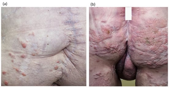 Skin symptoms also progressed, with there being a significant increase in the number of pathological elements in the anogenital area, as well as the appearance of multiple pink lenticular papules on the abdominal skin (Figure 6).