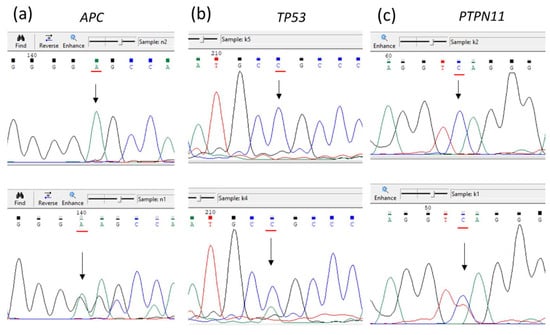 Sanger sequencing verified the presence of somatic mutations in the primary tumor: APC gene (a), TP53 gene (b), and PTPN11 gene (c). In the upper row, samples from peripheral blood are presented (wildtype); in the lower row, samples from primary adenocarcinoma containing mutations are presented (corresponding nucleotide positions are marked by red lines and arrows).