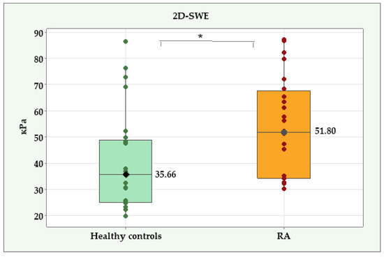 Two-dimensional point shear wave elastography (2D-SWE) in patients with RA and healthy controls. *—Significant difference at p < 0.05.