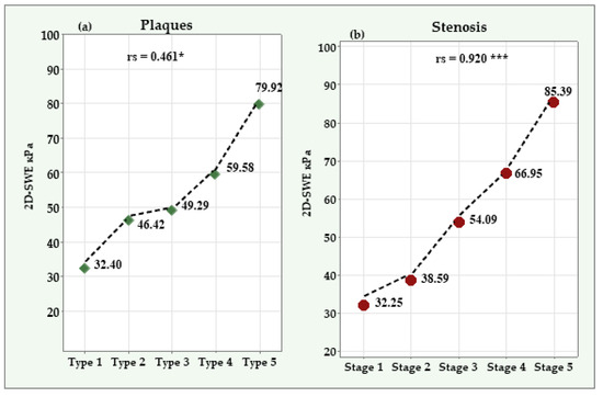 Significant positive correlations between 2D-SWE values, the severity of atherosclerotic plaques (panel a), and the degree of stenosis (panel b) in patients with RA. *—Significant correlation at p < 0.05; ***—significant correlation at p < 0.001.