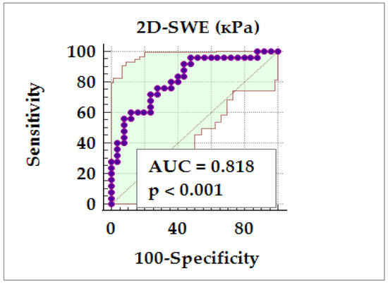 We performed a ROC curve analysis, coding all patients with RA with more severe atherosclerotic plaques (types 3, 4, and 5) as group 1, and all patients with RA with mild atherosclerotic plaques (types 1 and 2) as group 0. The results showed a significant area under the curve (AUC = 0.818; 95% CI: 0.683 to 0.913; p < 0.001). The optimal cut-off value of 2D-SWE > 32.40 kPa was associated with a sensitivity of 96%, a specificity of 56%, a positive predictive value (PPV) of 66.70%, and a negative predictive value (NPV) of 92.90% (Figure 4).