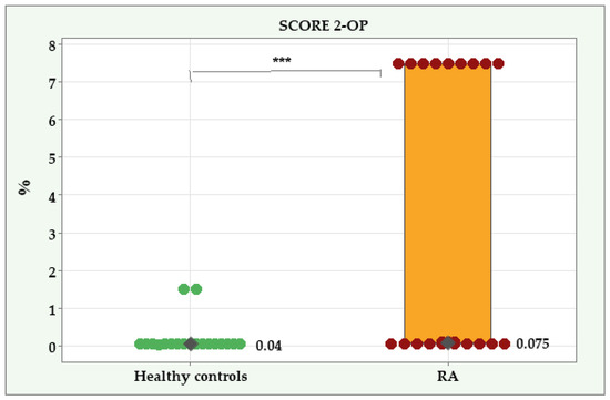 SCORE 2-OP in patients with RA and healthy controls. ***—Significant difference at p < 0.001.
