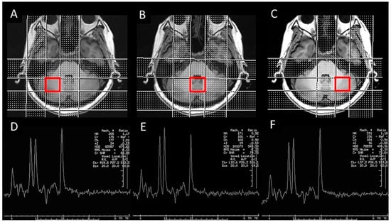 A representative schematic of cerebellar ROIs for MR spectroscopy. (A–C) Right cerebellar hemisphere, cerebellar vermis, and left cerebellar hemisphere ROIs. (D–F) Corresponding spectra for each ROI.