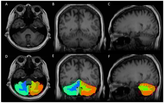 - Makris, N.; Hodge, S.M.; Haselgrove, C.; Kennedy, D.N.; Dale, A.; Fischl, B.; Rosen, B.R.; Harris, G.; Caviness, V.S.; Schmahmann, J.D.; et al. Human cerebellum: Surface-assisted cortical parcellation and volumetry with magnetic resonance imaging. J. Cogn. Neurosci. 2003, 15, 584–599. [Google Scholar] [CrossRef]