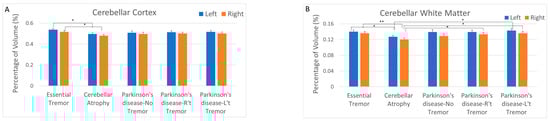 A quantitative volumetric analysis was performed on all brain MRIs. The quality of the subcortical segmentation with FreeSurfer was approved by the neuroradiologist in all cases. This analysis identified and quantified the right and left cerebellar gray and white matter, with adjustment for the volume of each area based on the overall size of the brain. Notably, a significant difference in the cerebellar cortical volume was found only between the patients with ET and cerebellar atrophy and the patients with PD. This difference was not observed between the patients with ET and the patients with PD, irrespective of the presence of tremor. No discernible difference was noted in the cerebellar volume between the patients with PD with and without tremor. Furthermore, in patients with PD with tremor, tremor laterality was not correlated with the differences in the left or right cerebellar volume (Figure 3A). Regarding the cerebellar white matter, similar findings were obtained; moreover, the patients with cerebellar atrophy exhibited a significantly reduced cerebellar white matter volume compared with all of the other patients. However, no significant difference was observed in the cerebellar white matter volume between the other four patient groups (Figure 3B).