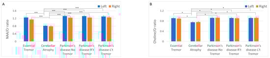Comparison of cerebellar magnetic resonance spectroscopy parameters between different groups. (A) N-acetylaspartate (NAA) to creatine (Cr) ratio, which indicates neuronal integrity. (B) Choline (Cho) to Cr ratio, which indicates metabolism. * p < 0.05; *** p < 0.01.