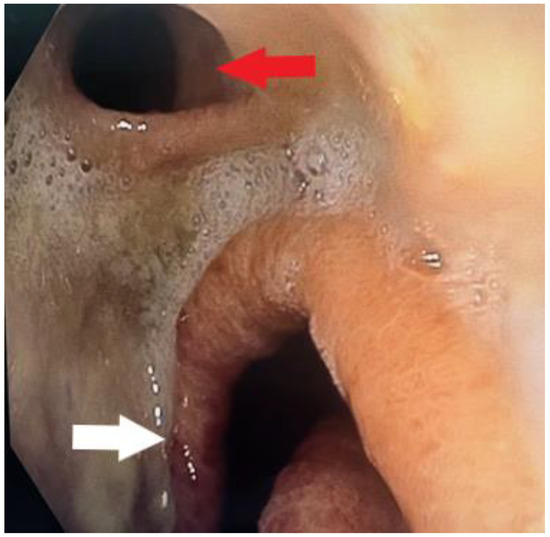 Upper GI endoscopy revealing a fistula orifice (red arrow) at the level of the esophagogastric anastomosis. A gastric tube was placed below (white arrow). At this point, it was obvious that endoscopic treatment of the fistula was not possible. The presence of fibrin around the fistula was indicative of a previous ulcer at the level of the esophagogastric anastomosis and a possible leak that had been clinically undetected.