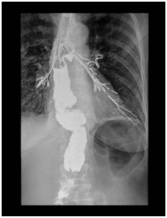 Contrast X-ray study showing the gastrobronchial leak. The diagnostic modalities include barium swallow, CT imaging, bronchoscopy, and upper gastrointestinal endoscopy. Identifying TEF can be challenging. Esophagoscopy can often miss small or discrete fistulas, even with fluoroscopy. Contrast radiography is a very useful method in terms of establishing this diagnosis. It is actually the confirmatory test for TEF. The appearance of barium in the lumen of the tracheobronchial tree is a direct sign of the fistulization of these structures within the esophagus. This picture shows a clear esophagobronchial leak, which provoked an irritating cough during the patient’s examination.